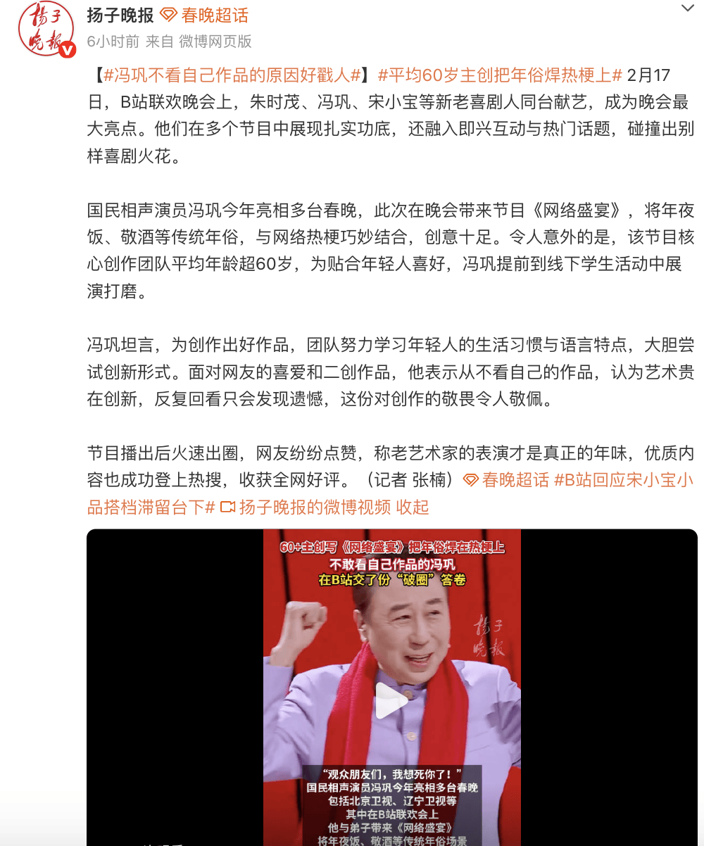 2月17日,B站联欢晚会上,朱时茂、冯巩、宋小宝等新老喜剧人同台献艺,成为晚会最大亮点。他们在多个节目中展现扎实功底,还融入即兴互动与热门话题,碰撞出别样喜剧火花。